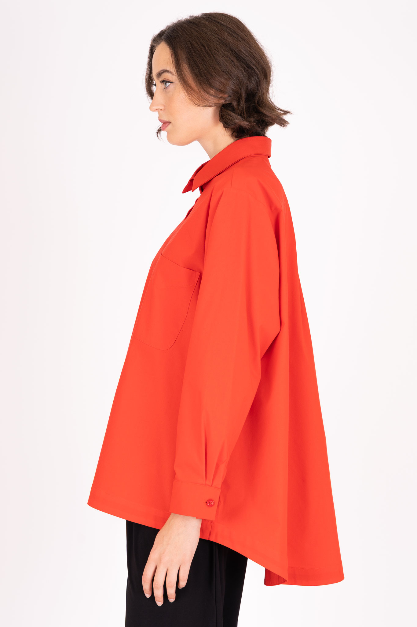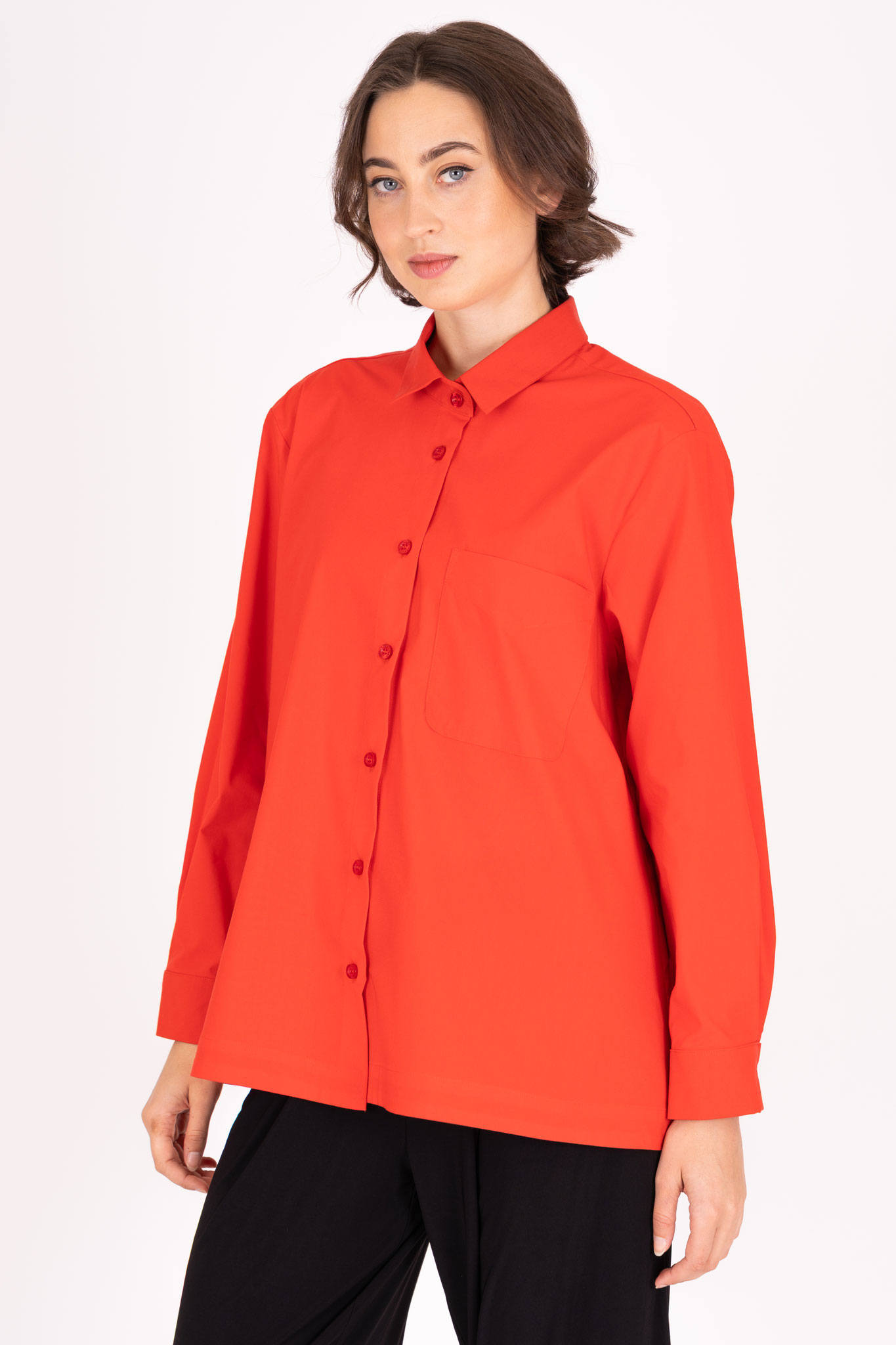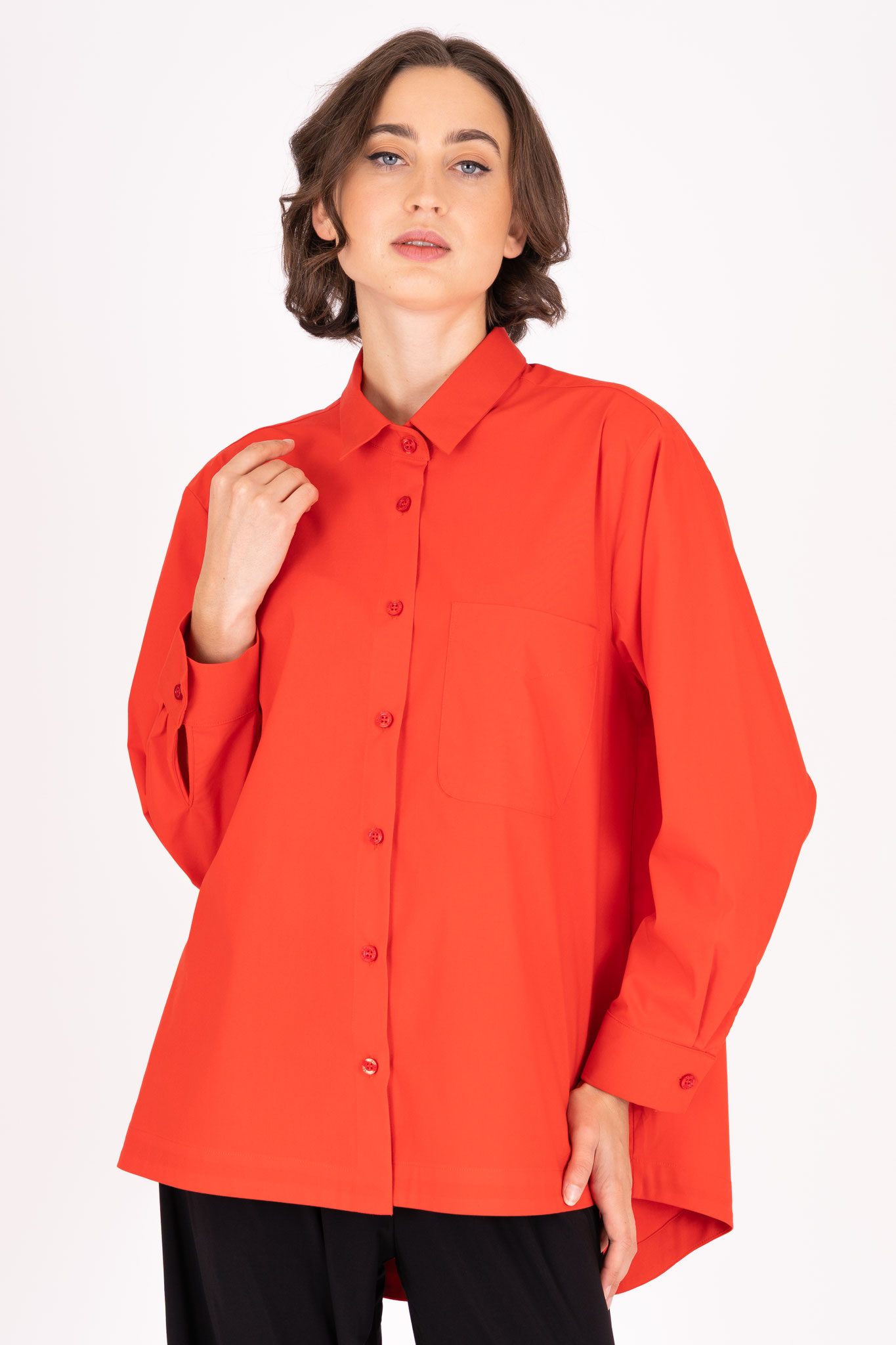 Diese Baumwollbluse eignet sich durch die großzügige Schnittführung in weiter, ausfallender A-Form besonders für eine etwas weitere Figur. Die aufgesetzte Tasche auf der Brust lockert die Vorderseite auf.
