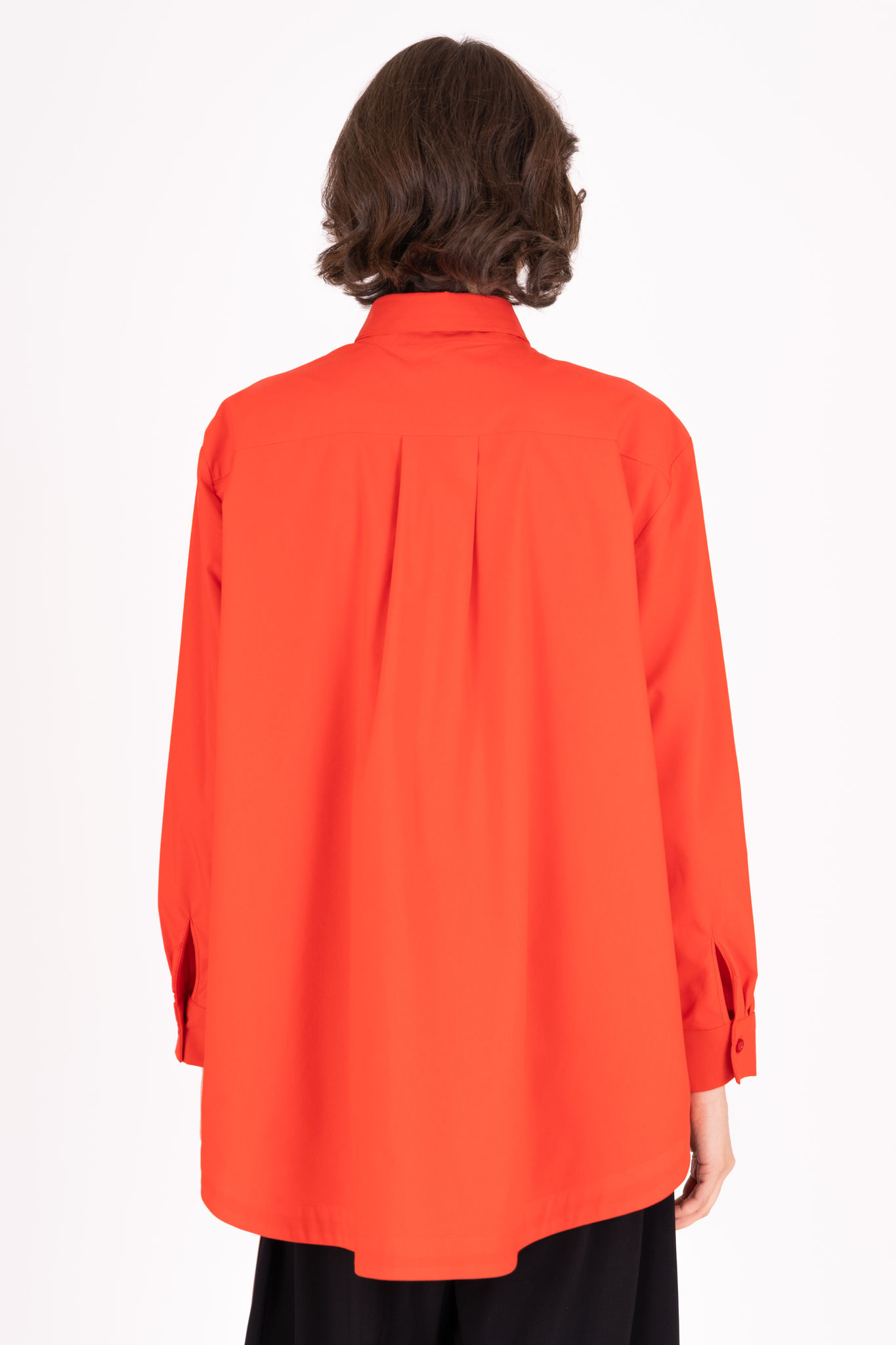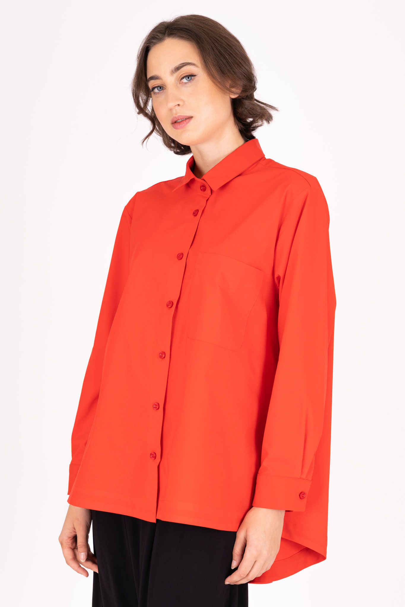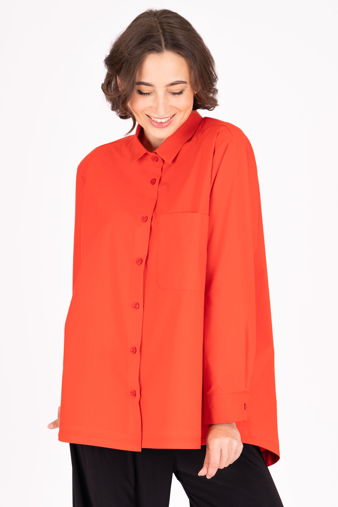 Diese Baumwollbluse eignet sich durch die großzügige Schnittführung in weiter, ausfallender A-Form besonders für eine etwas weitere Figur. Die aufgesetzte Tasche auf der Brust lockert die Vorderseite auf.