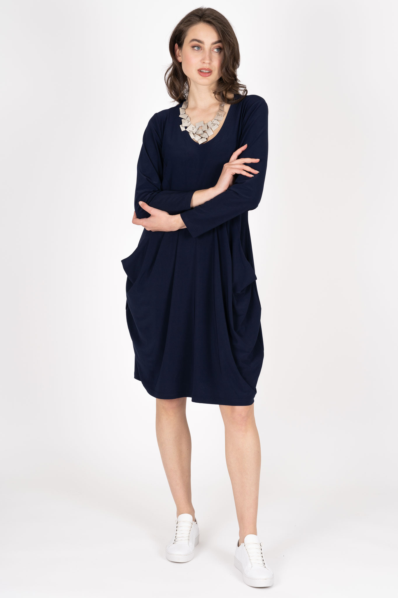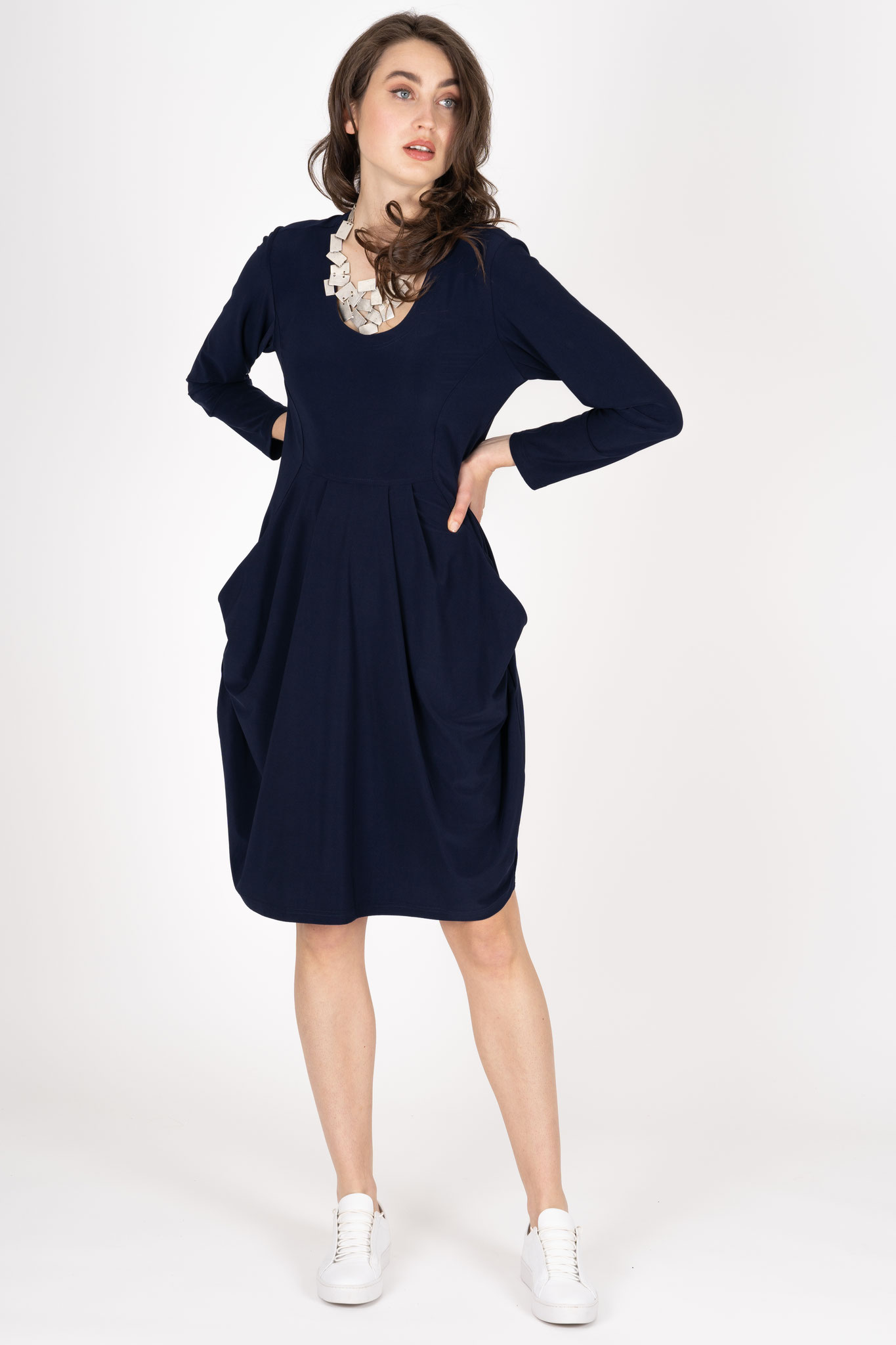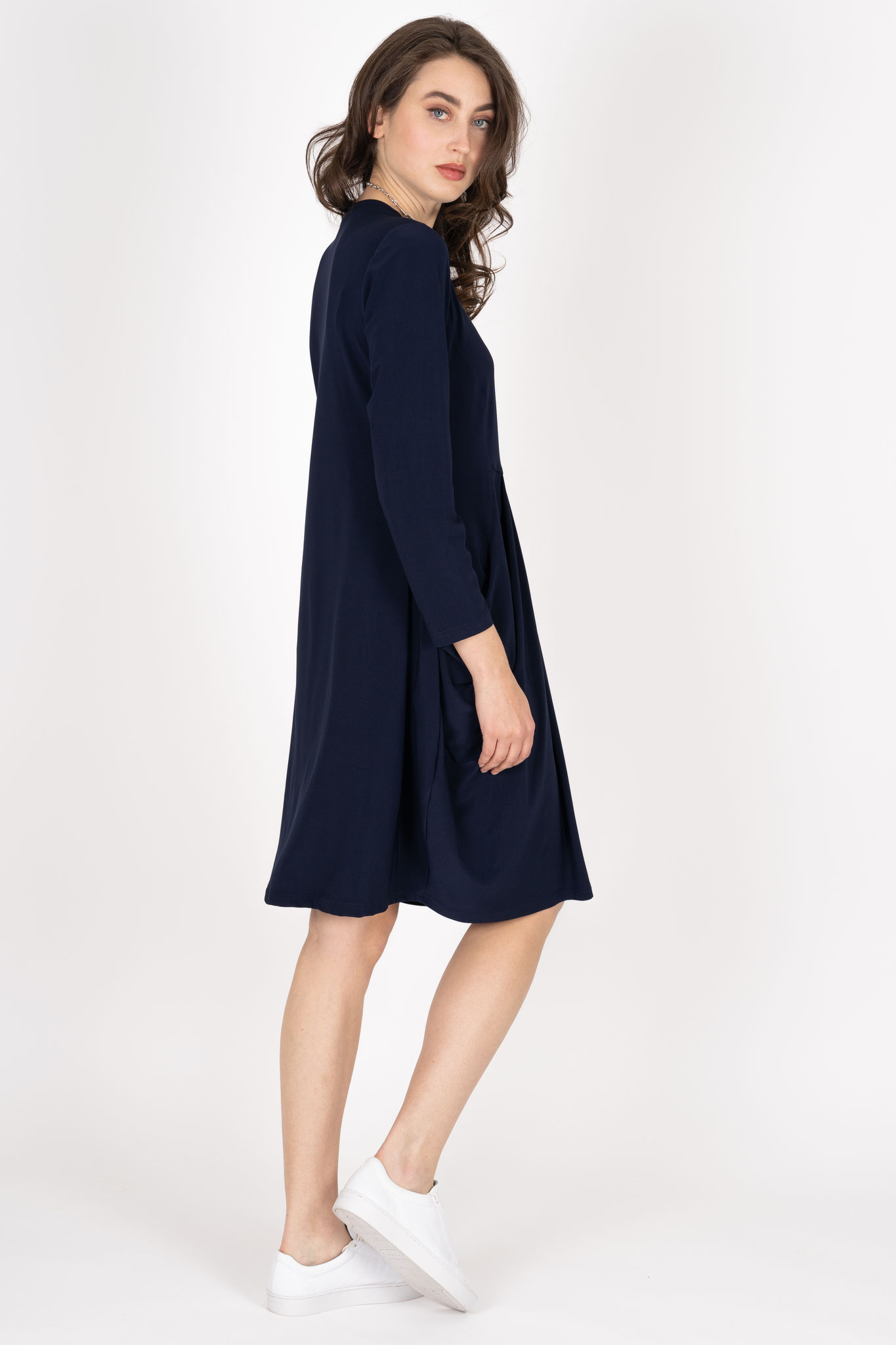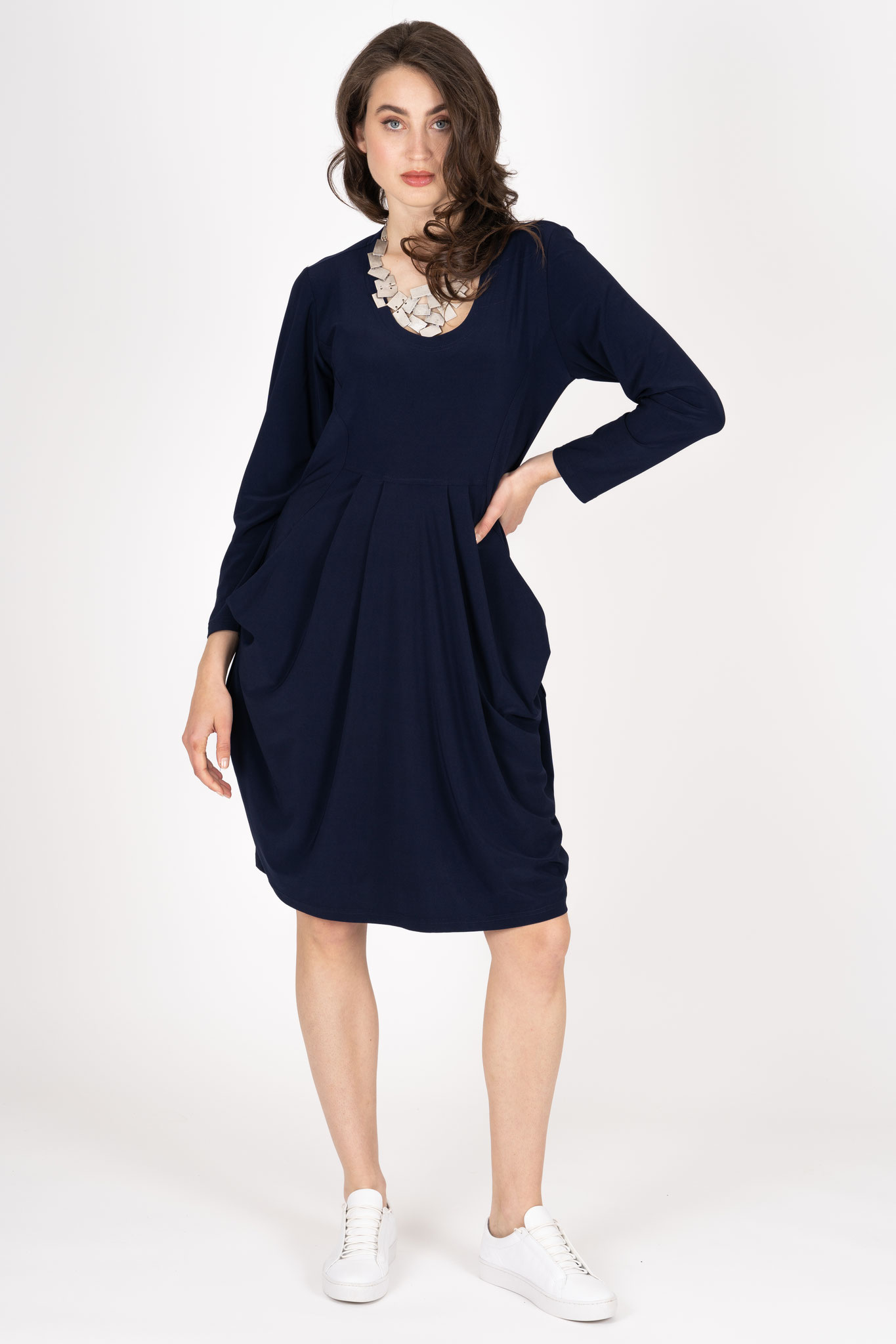 Vorteilhafter Schnitt und klare Linien bilden hier eine einmalige Harmonie. Das Kleid ist dank seines ausgefallenen Schnittes auch bis zur Größe 46 sehr zu empfehlen. Die horizontale Naht unter der Brust und die mittleren Raffungen, die fließend in die seitlichen Taschen übergehen, verleihen dem Kleid seine besondere Optik. Hinten ist das Kleid schlicht gehalten.