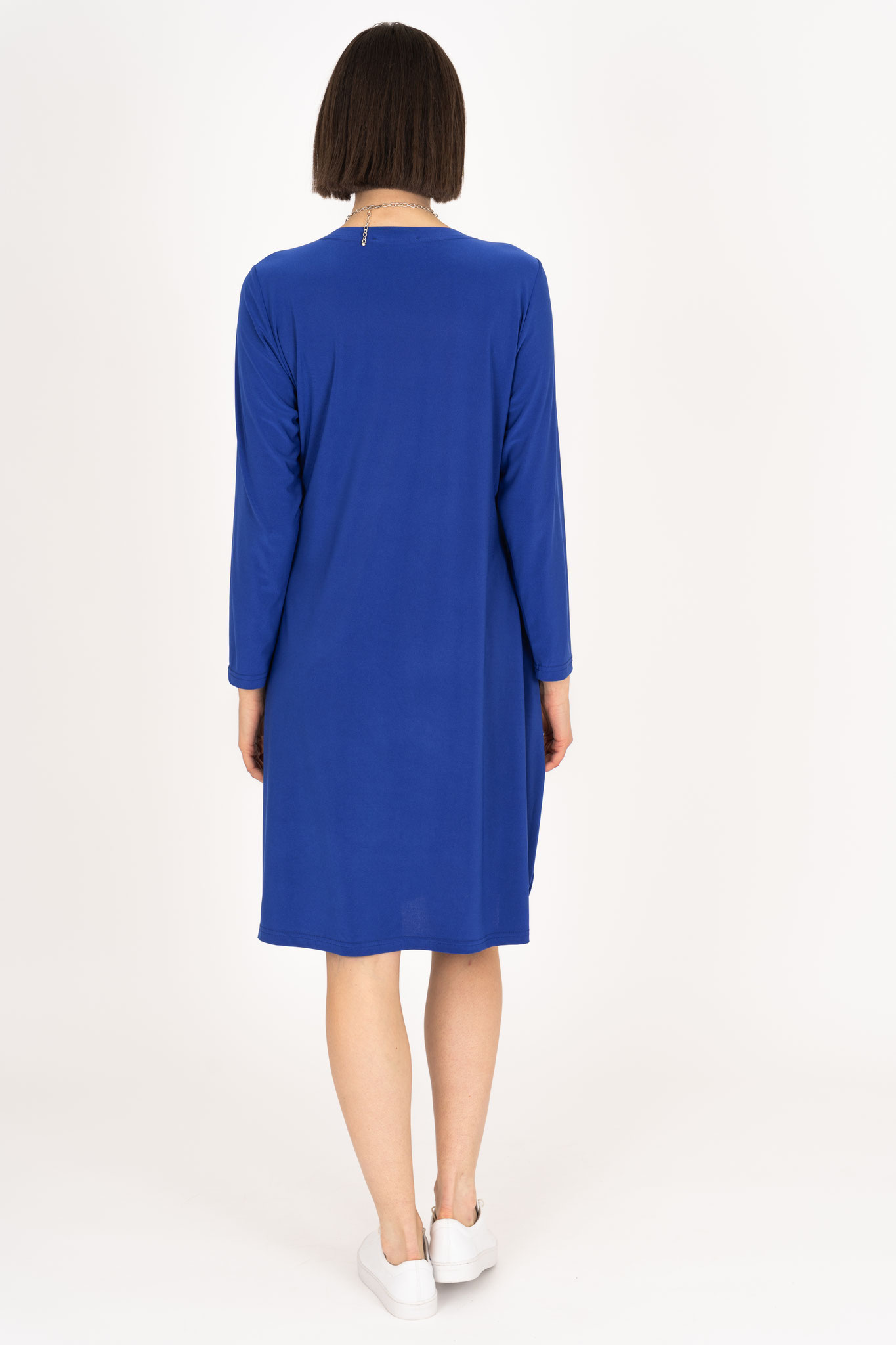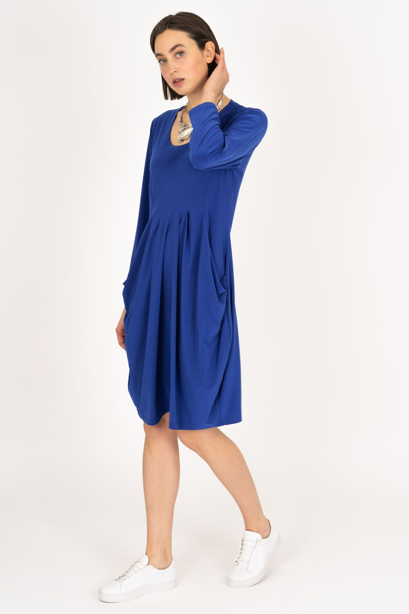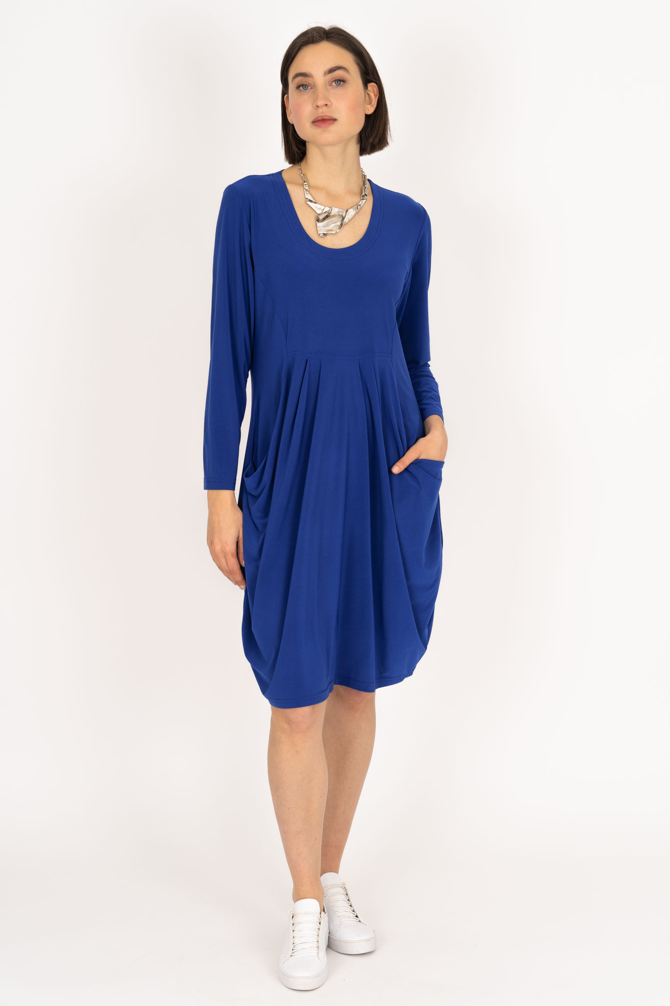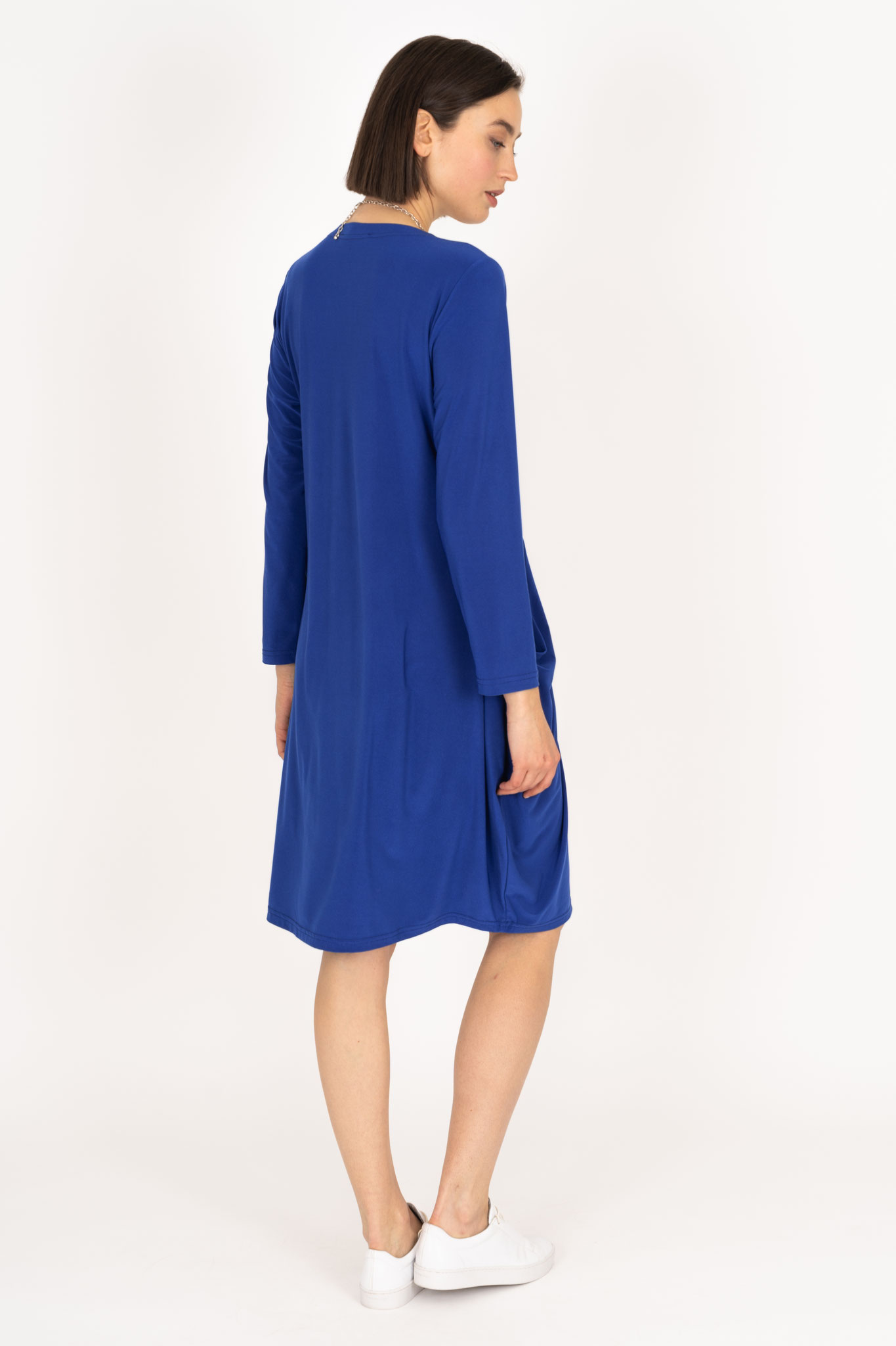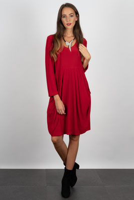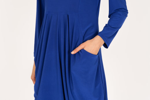 Vorteilhafter Schnitt und klare Linien bilden hier eine einmalige Harmonie. Das Kleid ist dank seines ausgefallenen Schnittes auch bis zur Größe 46 sehr zu empfehlen. Die horizontale Naht unter der Brust und die mittleren Raffungen, die fließend in die seitlichen Taschen übergehen, verleihen dem Kleid seine besondere Optik. Hinten ist das Kleid schlicht gehalten.