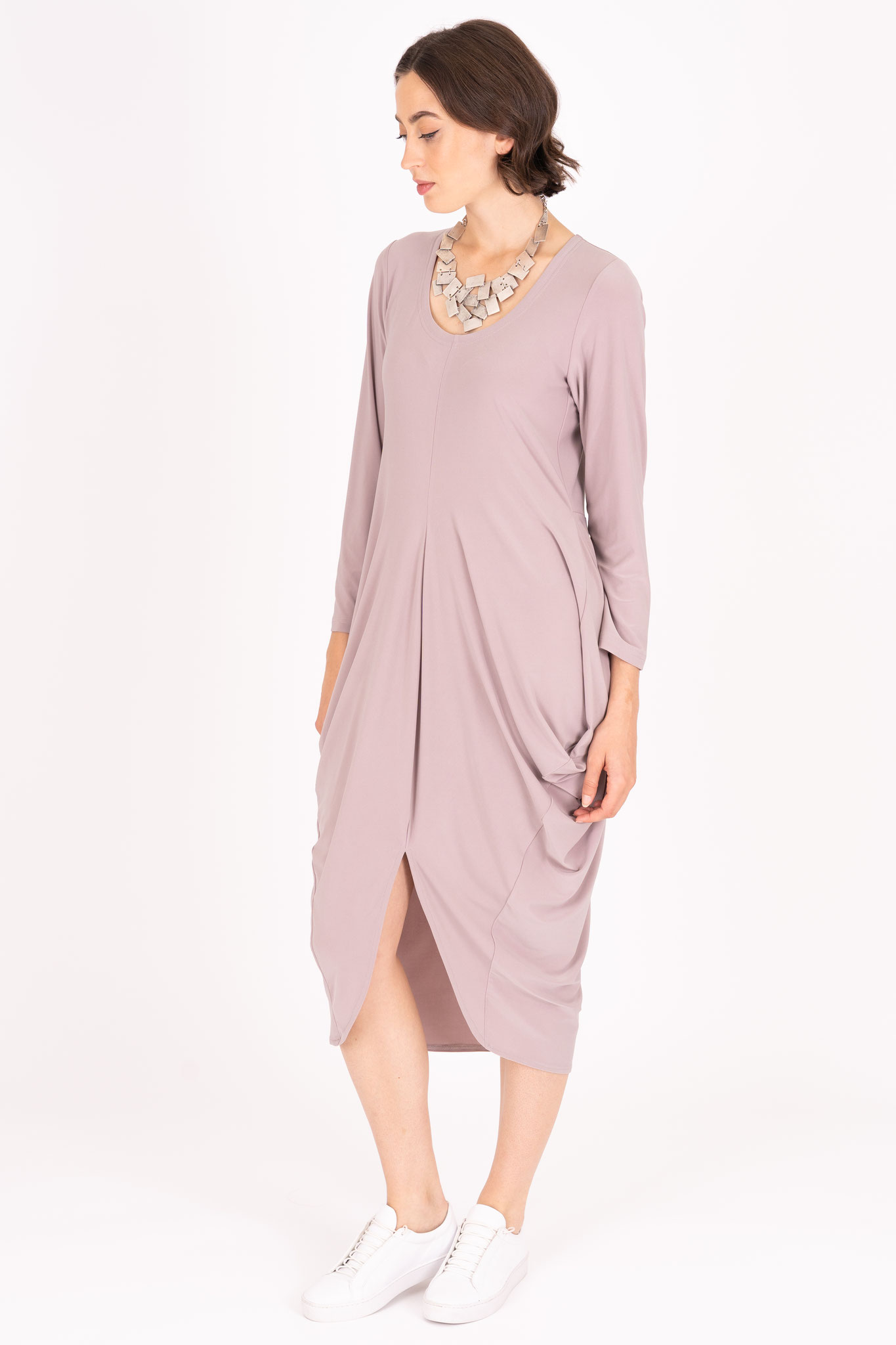 Das Kleid begeistert durch seinen edlen, extravaganten Schnitt. Vorne ist es mit dem Gehschlitz, den zahlreichen Raffungen und dem fließenden Übergang hin zum Rockteil sehr auffallend. Hinten ist es hingegen eher schlicht gehalten. Das Kleid ist nicht nur wegen der Designmerkmale, sondern auch durch den Schnitt sehr feminin. Dieser folgt dezent sanduhrförmig der weiblichen Figur.