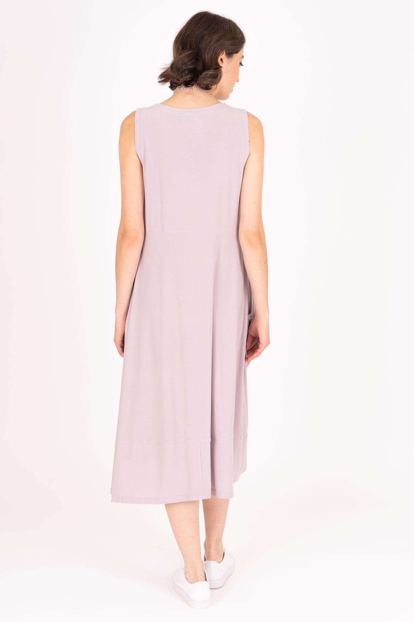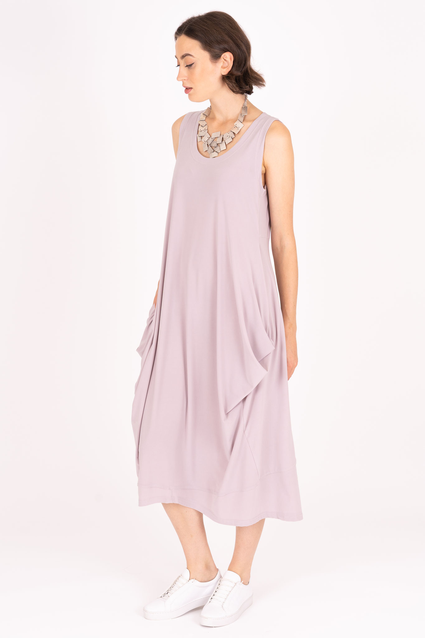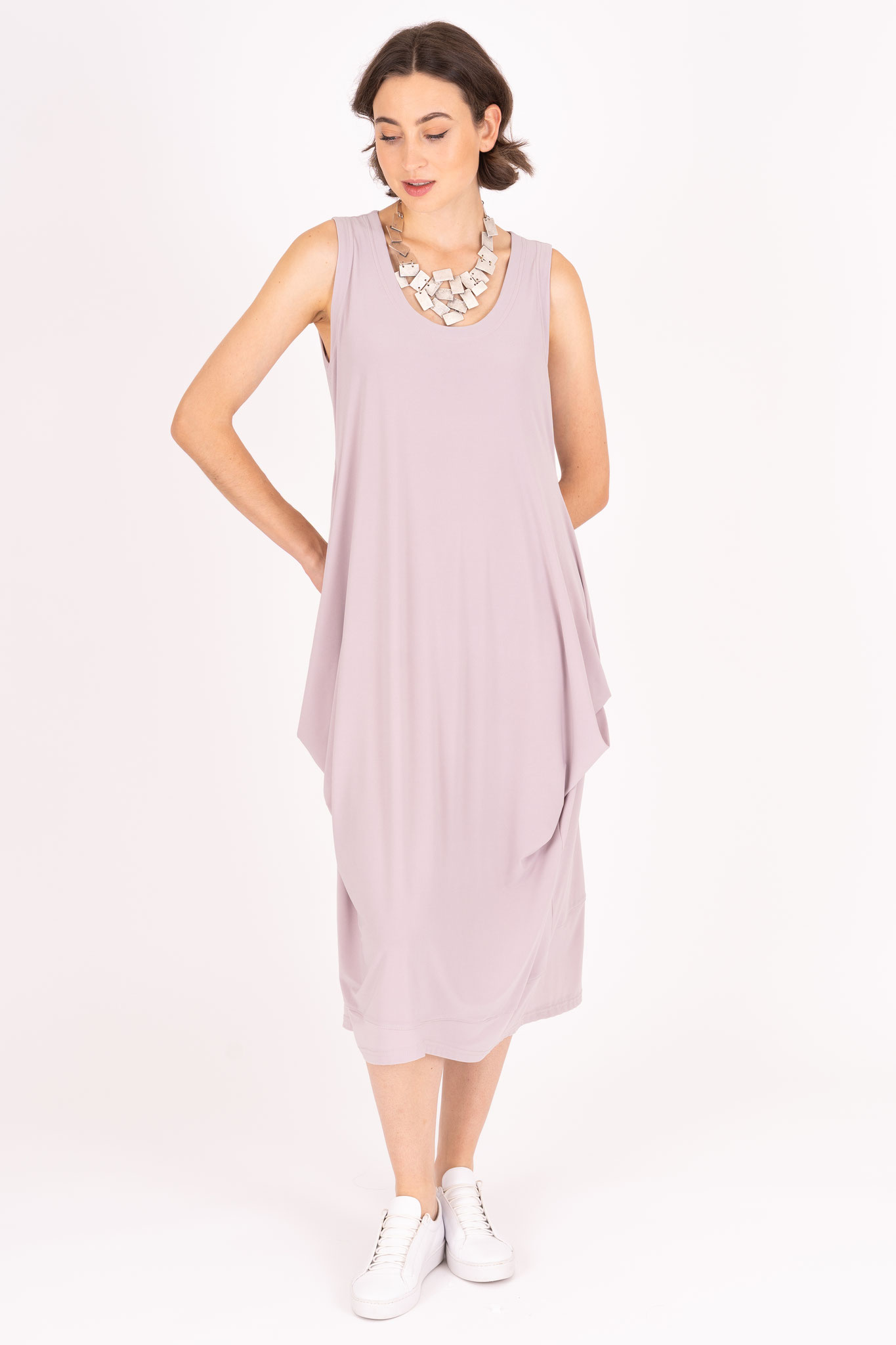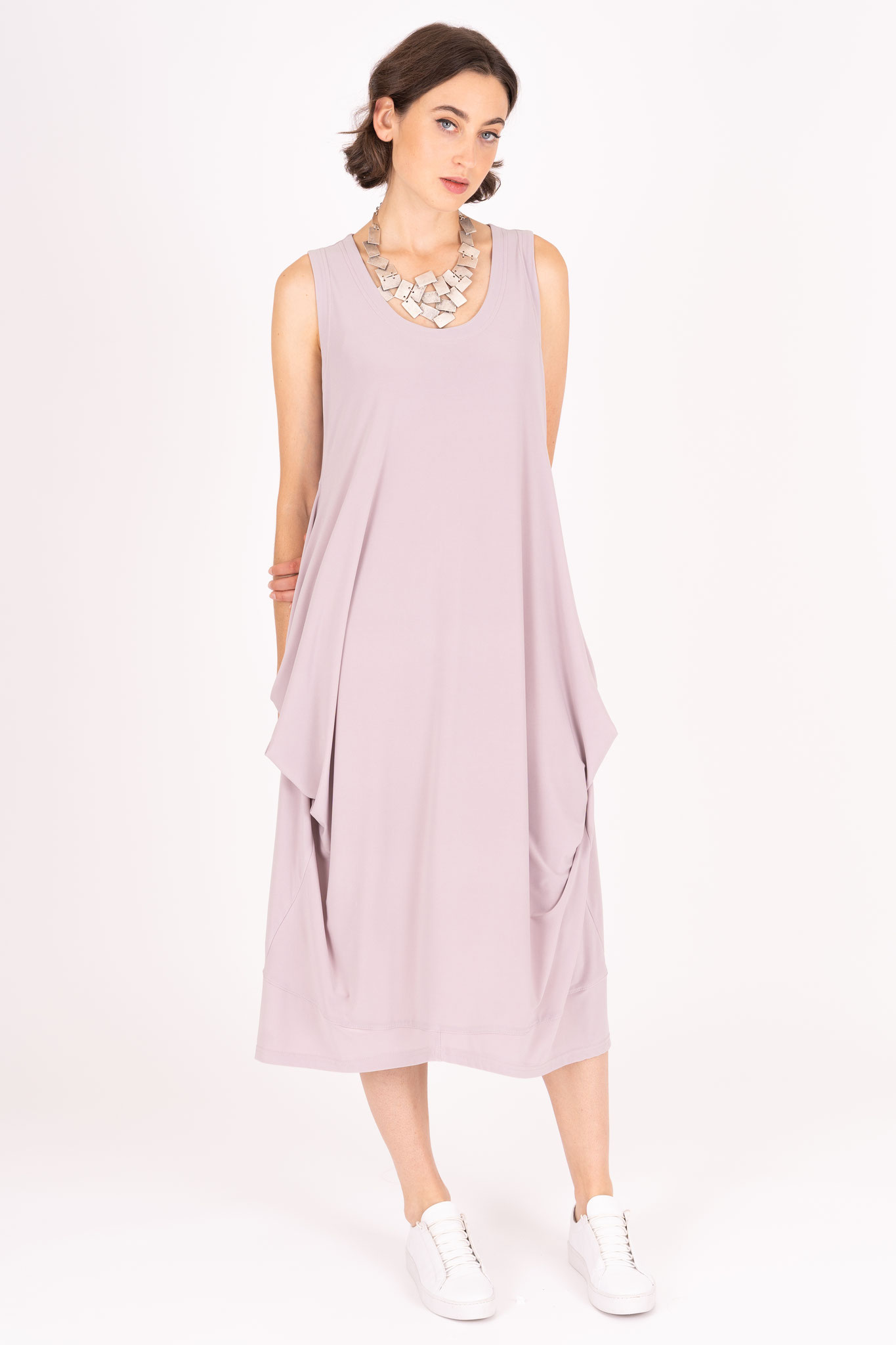 Das Kleid ist in einer schmeichelnden A-Linie ausgestellt und seitlich gerafft, wodurch in einem weichen Übergang seitliche Taschen angedeutet werden. Bei dem Schnitt wird der Oberkörper schmeichelhaft betont, während der Stoff unten locker und weit fällt.