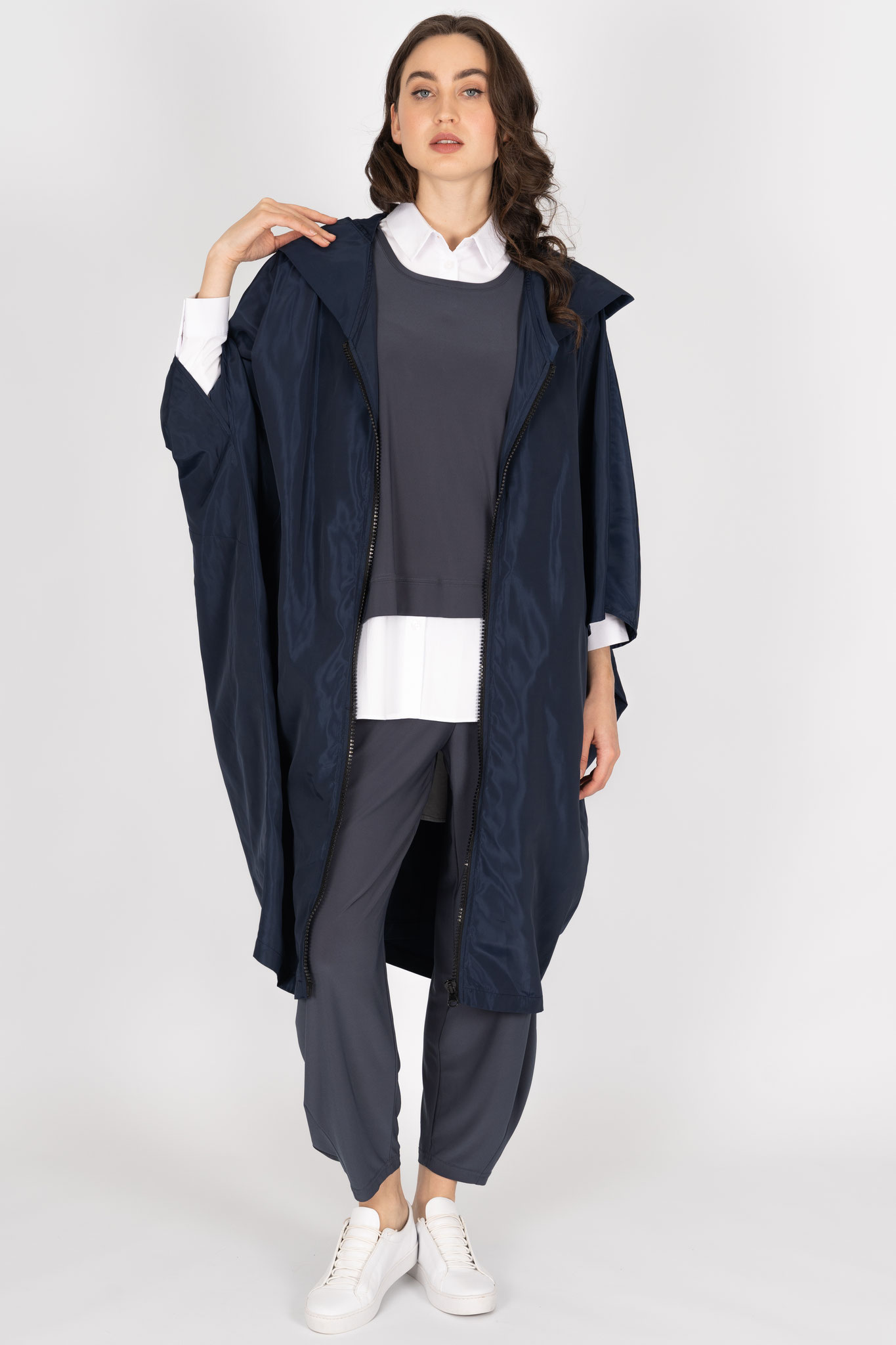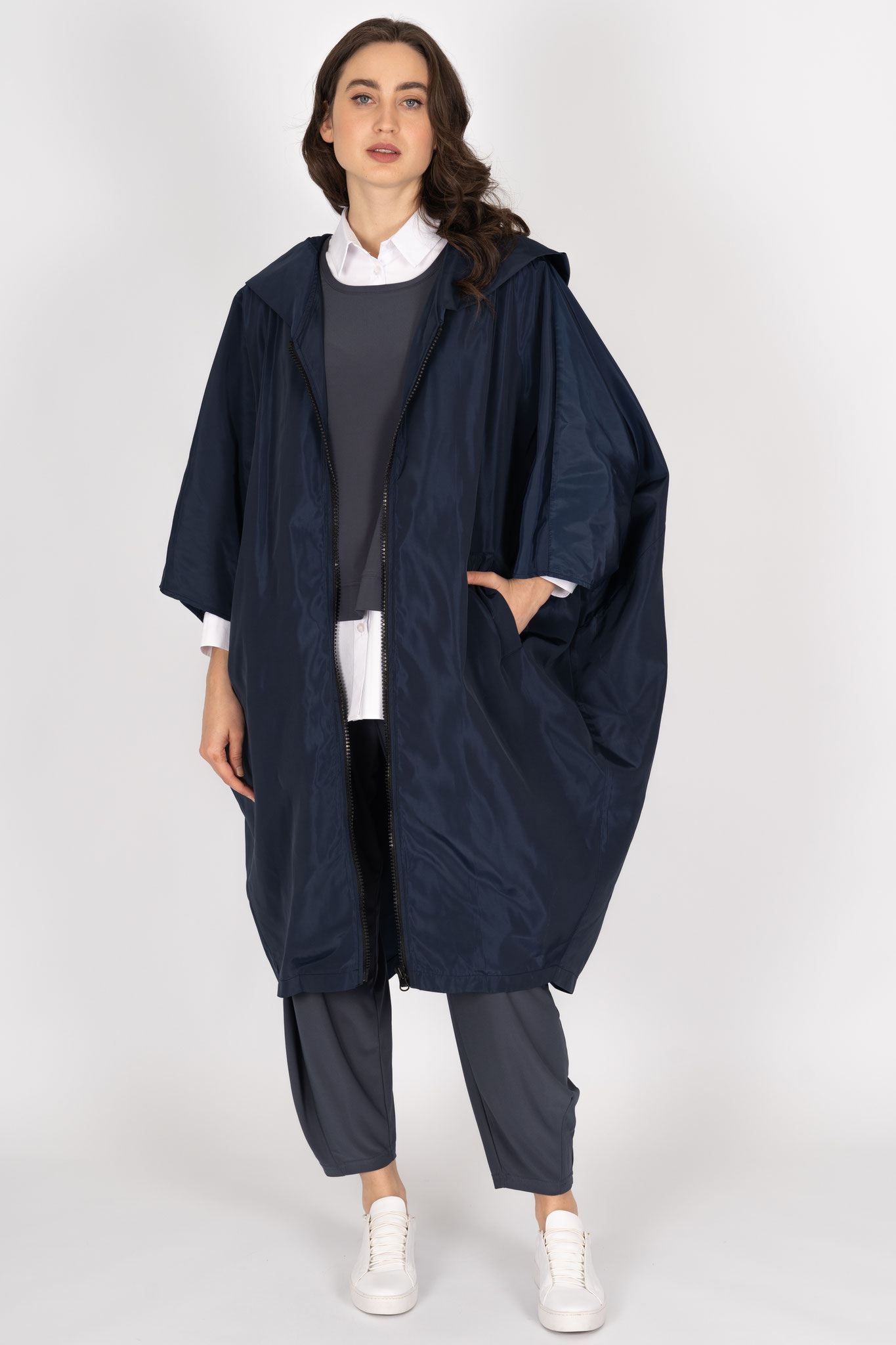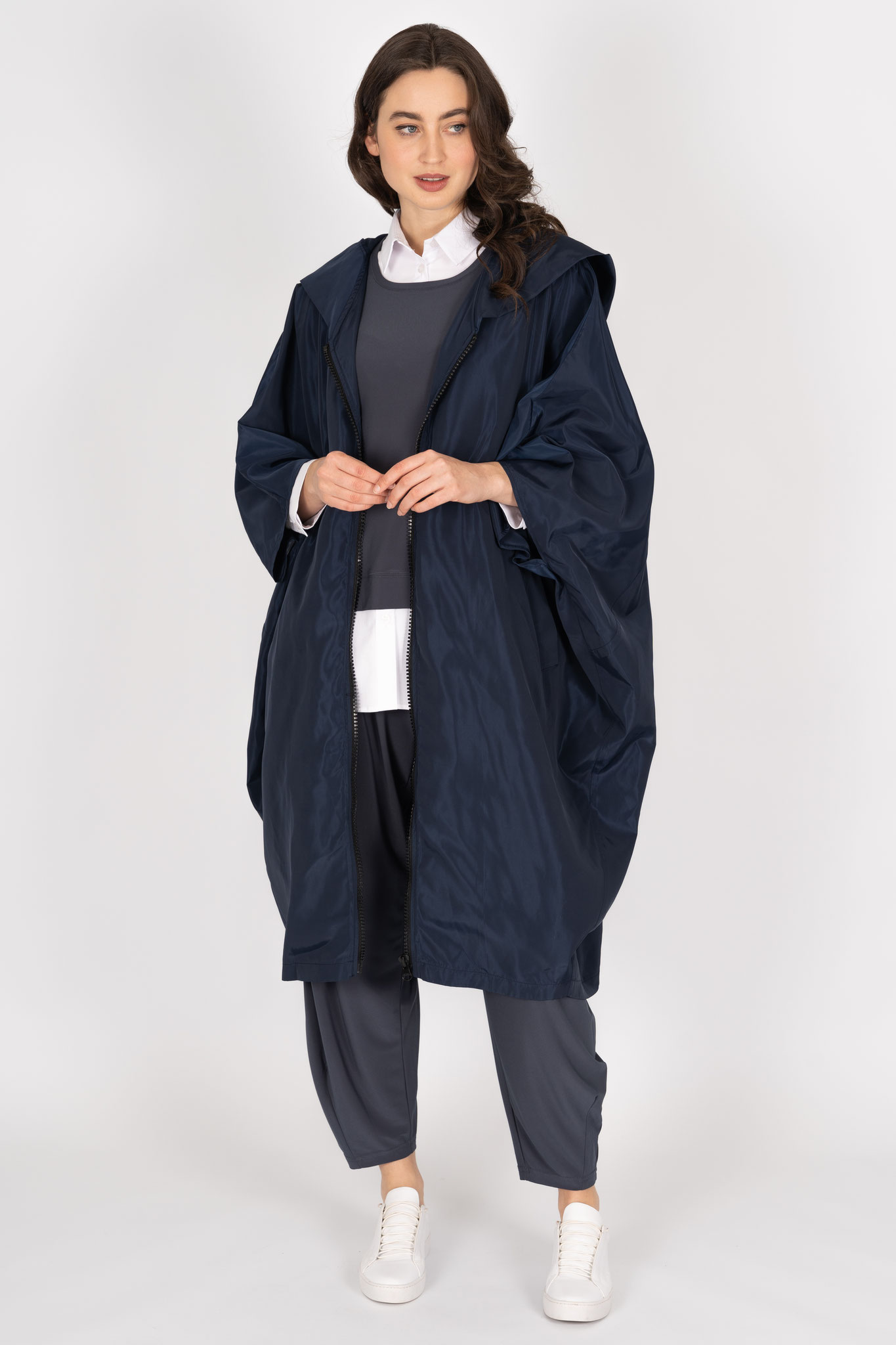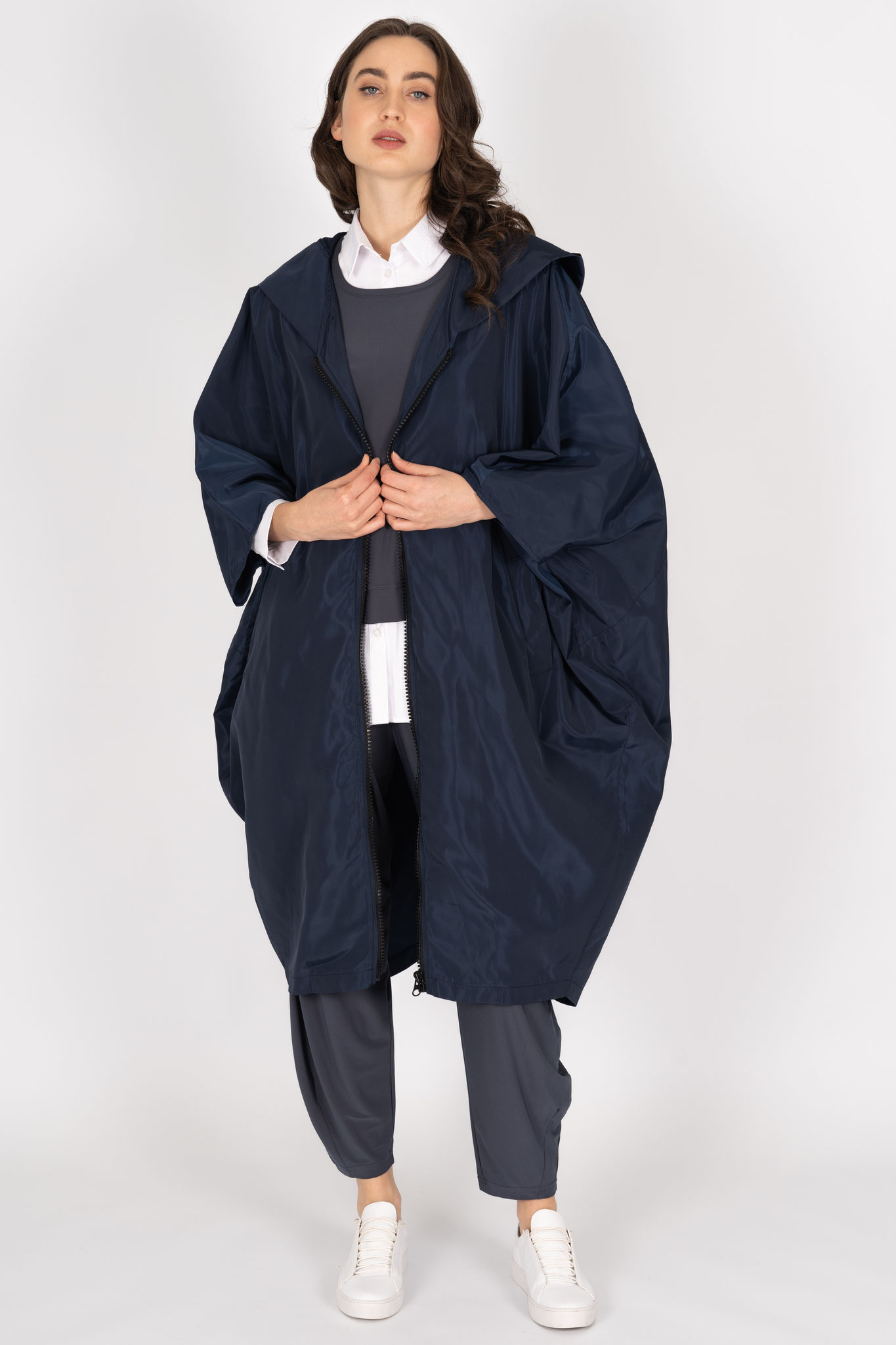 Großes Cape mit Fledermausärmeln und Kapuze im Oversize Look. Der übergroße Reißverschluss rundet die Kreation harmonisch ab. Die praktischen Taschen lösen die große Fläche vorne auf.Mithilfe des Druckknopfes am Rücken lässt sich die Schnittform der Kreation verschmälern oder erweitern.