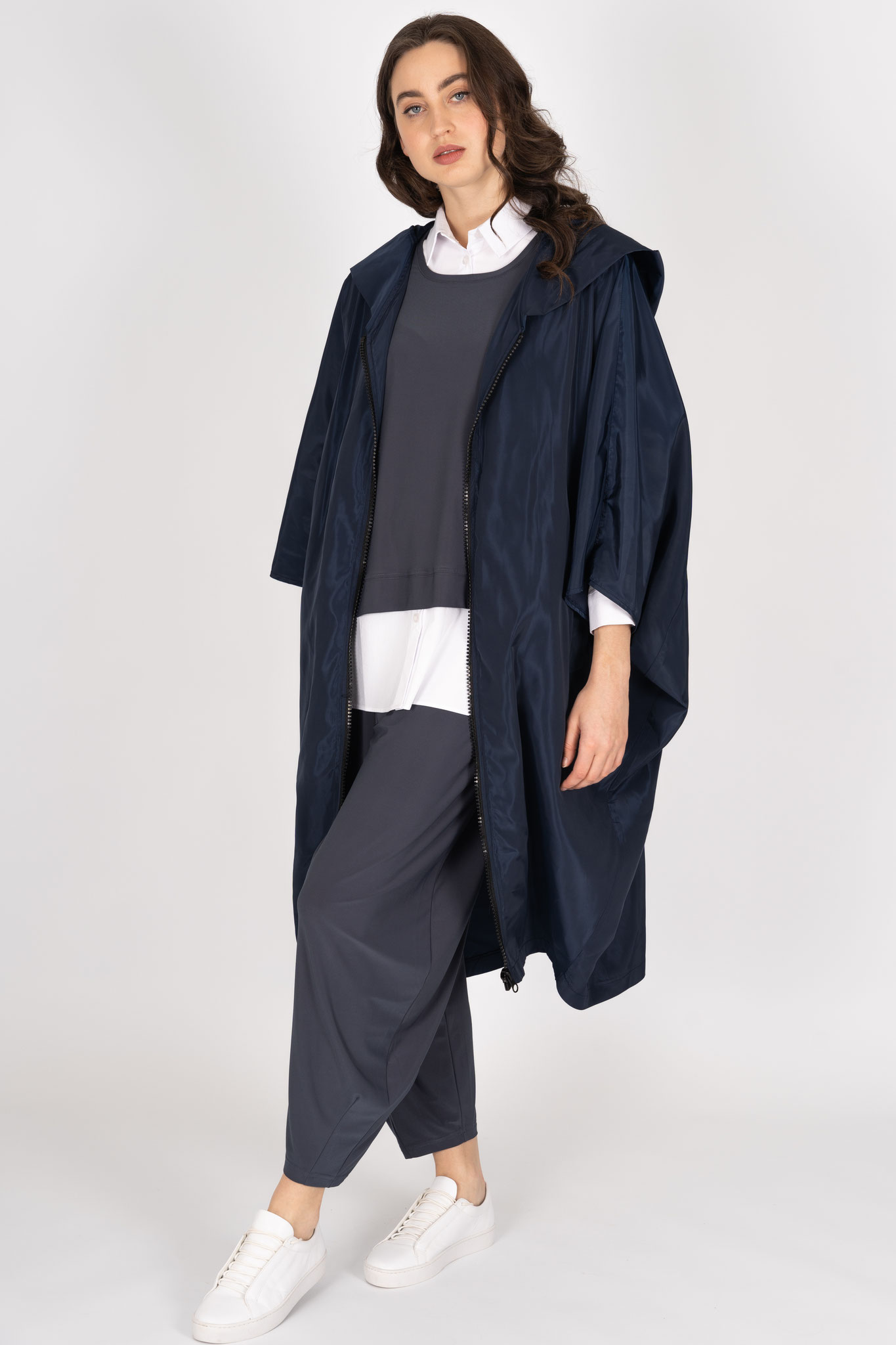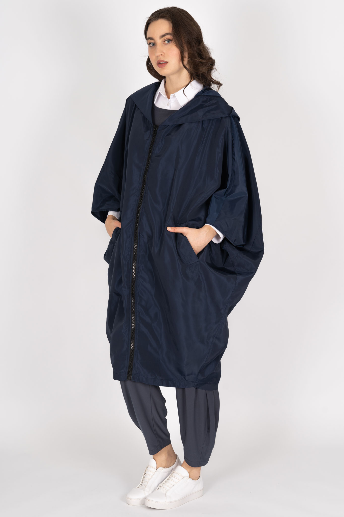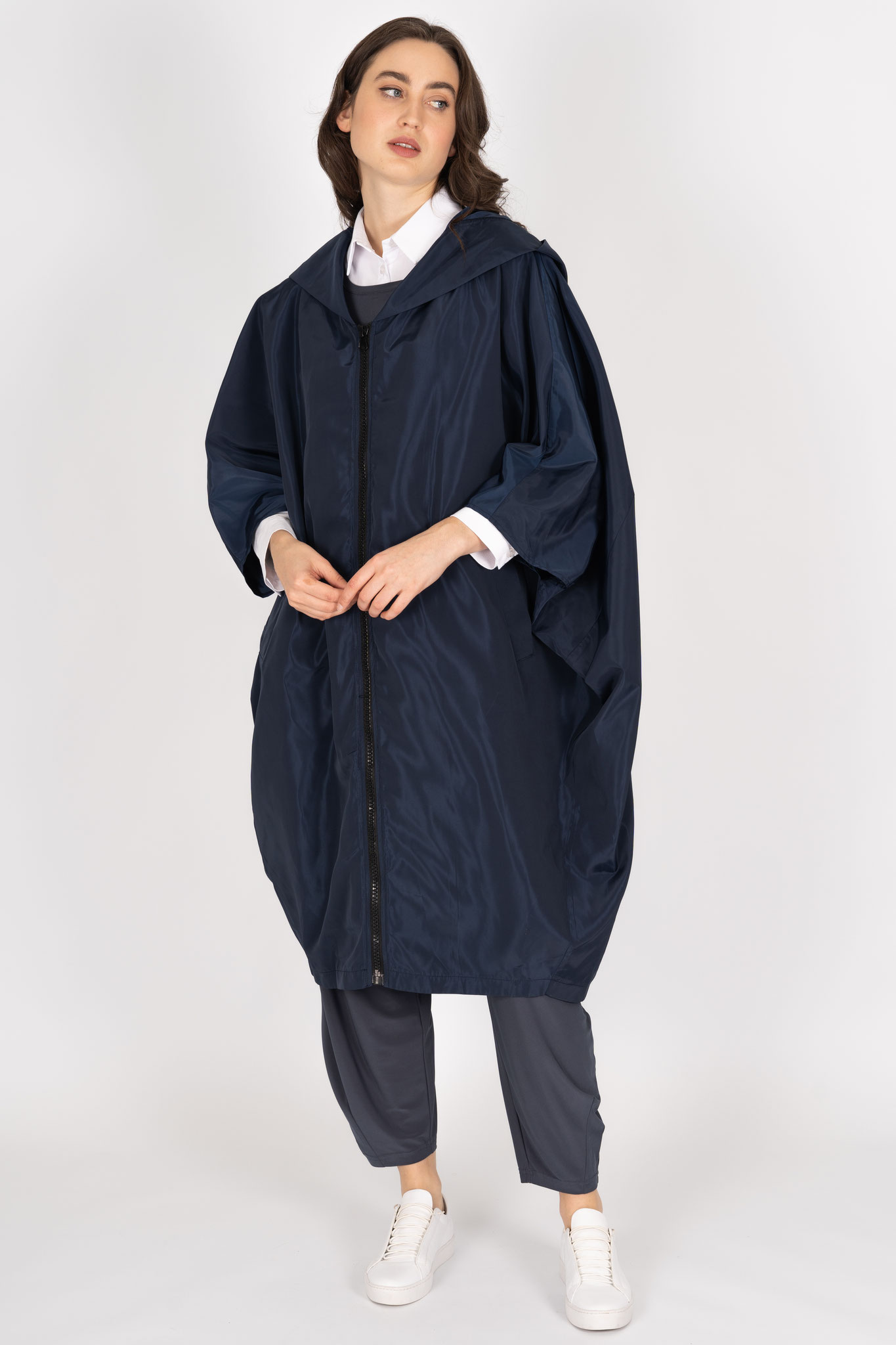 Großes Cape mit Fledermausärmeln und Kapuze im Oversize Look. Der übergroße Reißverschluss rundet die Kreation harmonisch ab. Die praktischen Taschen lösen die große Fläche vorne auf.Mithilfe des Druckknopfes am Rücken lässt sich die Schnittform der Kreation verschmälern oder erweitern.