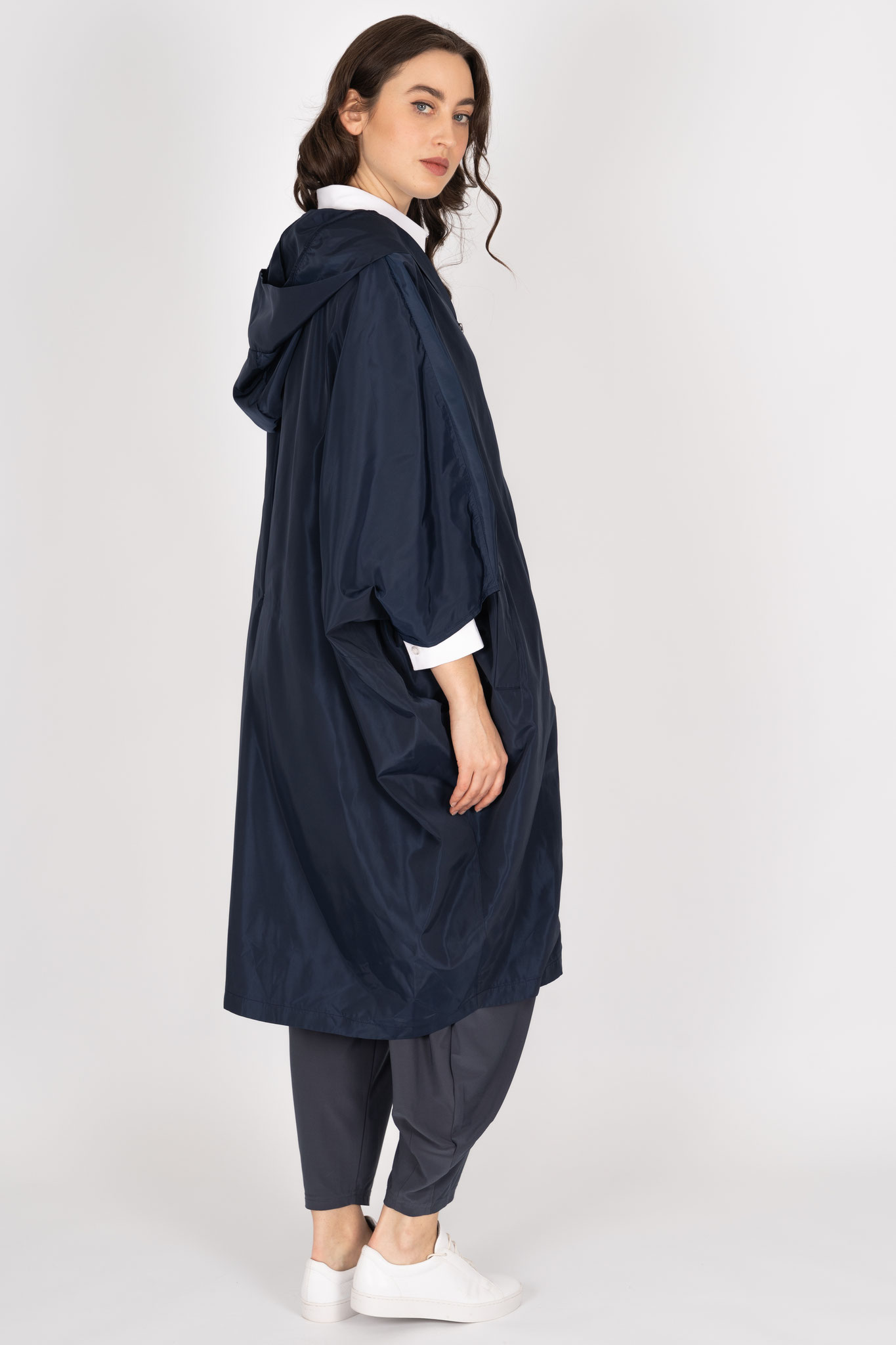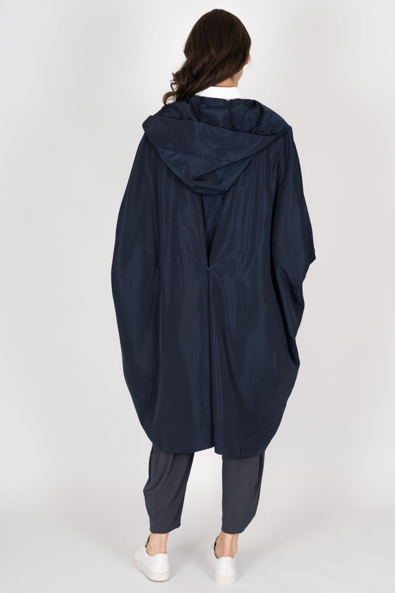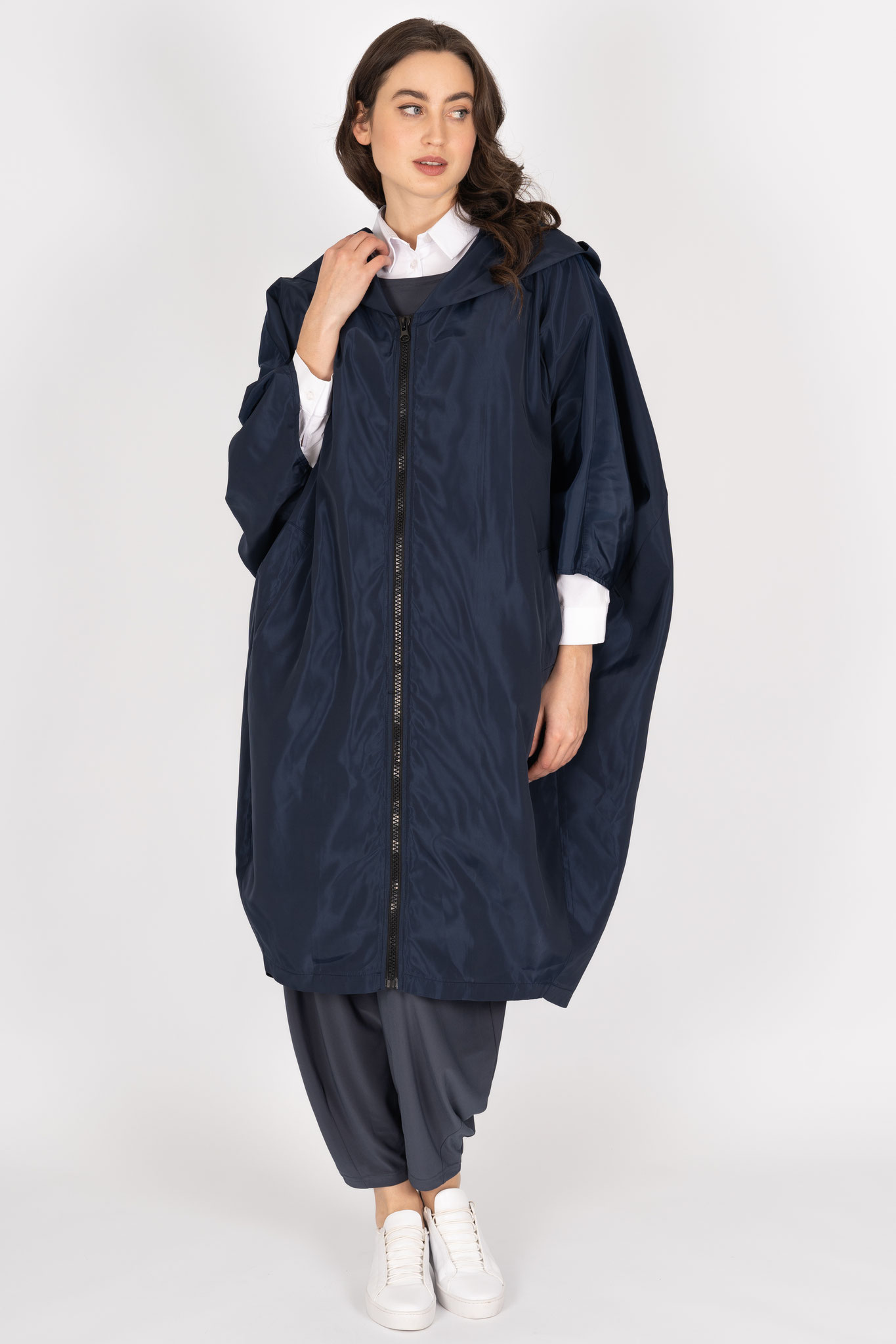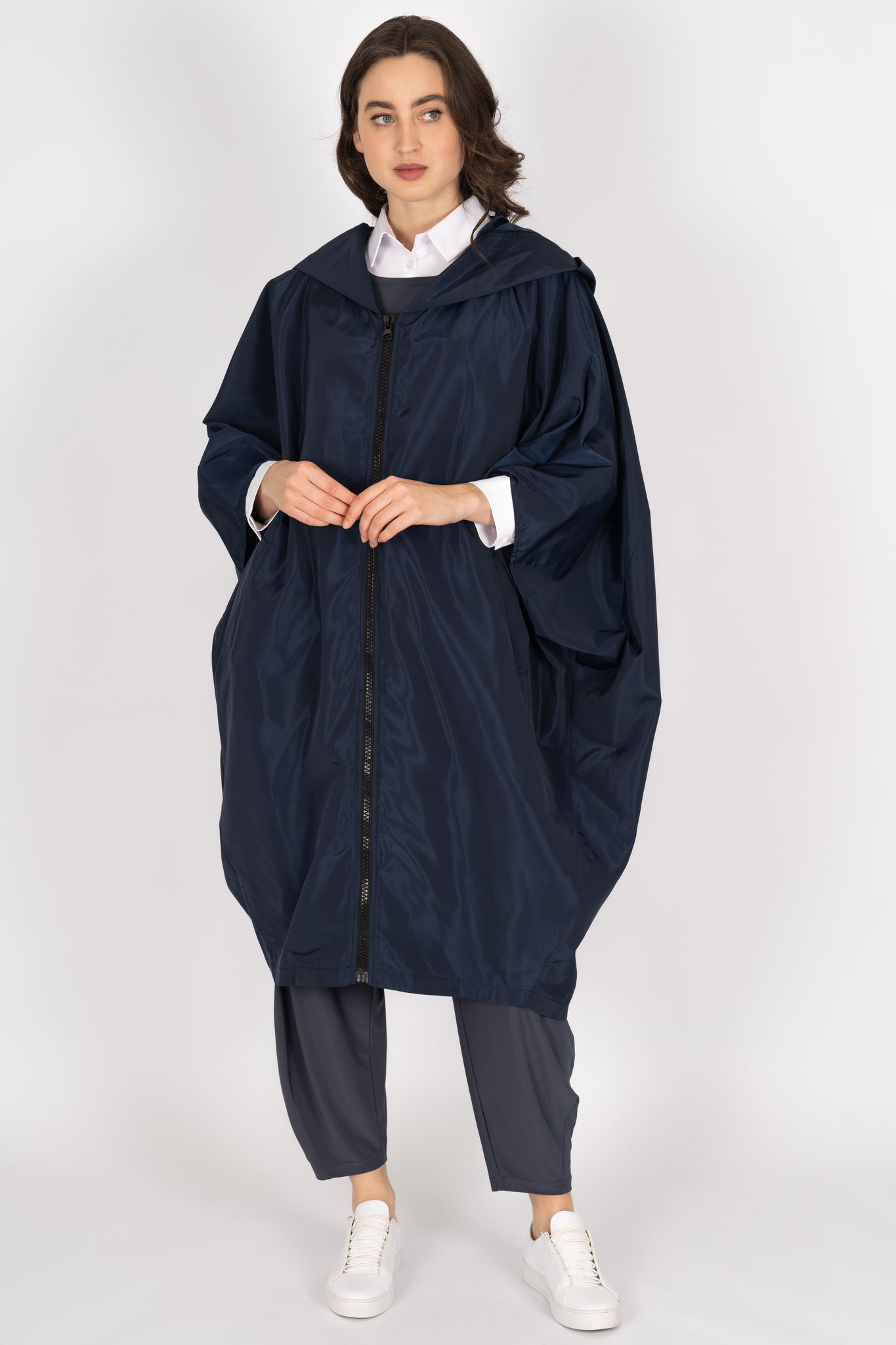 Großes Cape mit Fledermausärmeln und Kapuze im Oversize Look. Der übergroße Reißverschluss rundet die Kreation harmonisch ab. Die praktischen Taschen lösen die große Fläche vorne auf.Mithilfe des Druckknopfes am Rücken lässt sich die Schnittform der Kreation verschmälern oder erweitern.